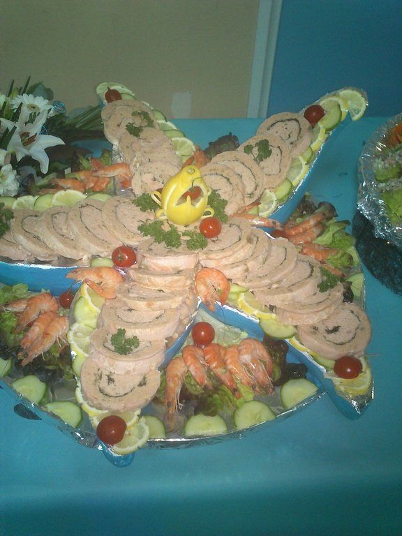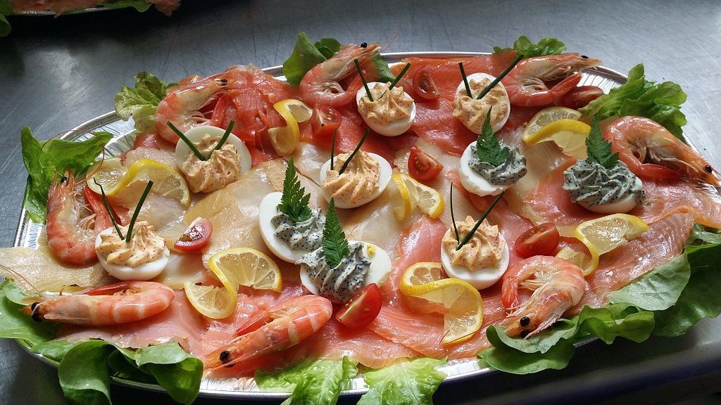 Plat traiteur : saumon, crevettes, oeufs mayo